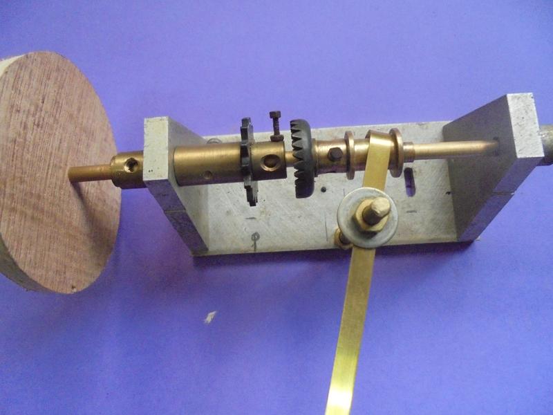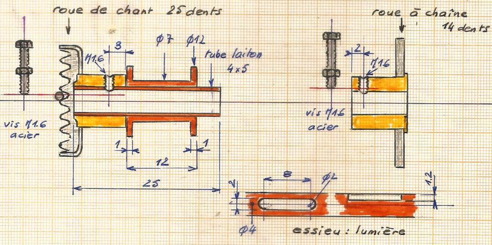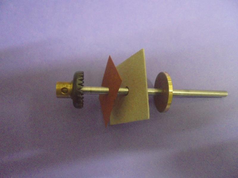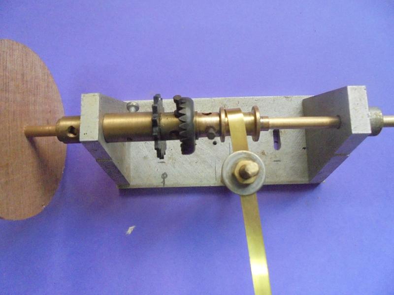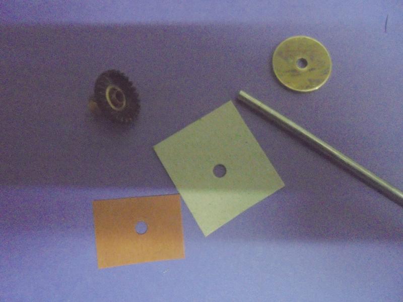 Position de débrayage : l'axe est immobilisé par 2 bagues. La roue de chant et la roue d'entraînement glissent sur cet axe et un ressort les maintient en pression. Une plaque de laiton avec un U (un L serait bien suffisant) servira de guide : un levier coulissant permet d'éloigner la roue de chant du pignon moteur.