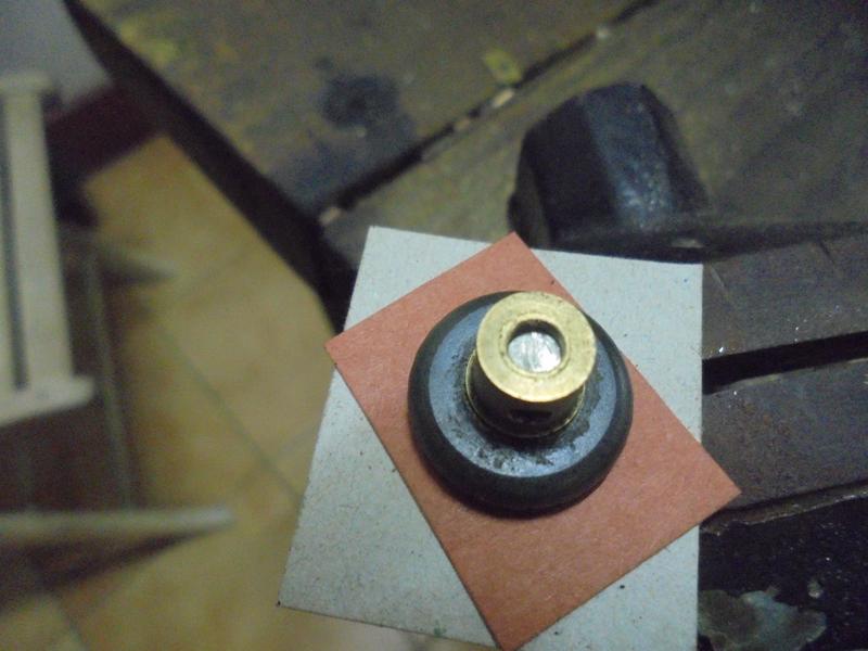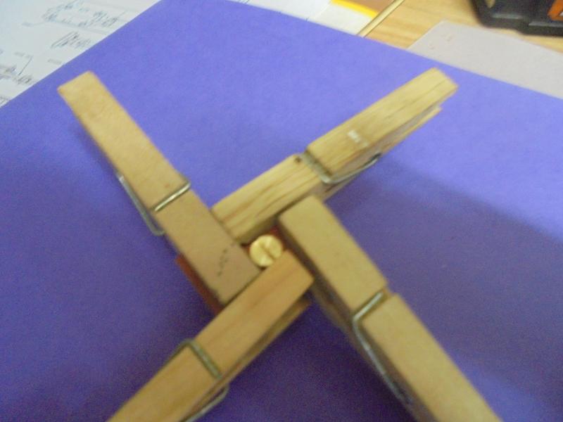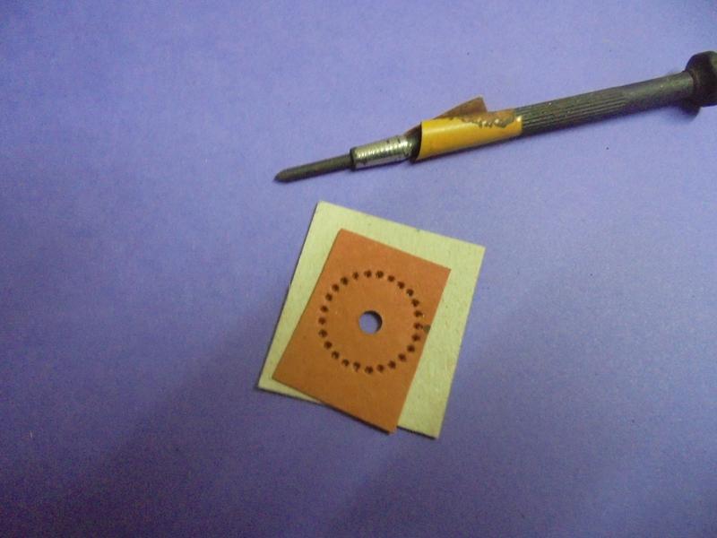 Le disque est en laiton de 22 de diamètre et de 2 d'épaisseur. Une fois l'empreinte obtenue, on la fixe sur le disque avec de la colle blanche de menuisier non diluée. Si on se plante un peu, on peut reprendre les empreintes du perçage avec une fraise conique (perceuse à main). Ce disque servira pour un autre montage où il sera soudé à l'étain sur une roue dentée en laiton plus grande que la roue de chaîne. |