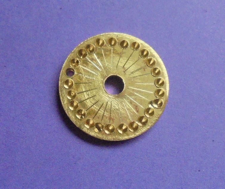 On peut aussi fabriquer un disque d'embrayage : du carton pour prendre les empreintes, et perçages de 25 trous de 1.8 de diamètre - pas de chanche, le plateau diviseur ne compte que 24 graduations ... |