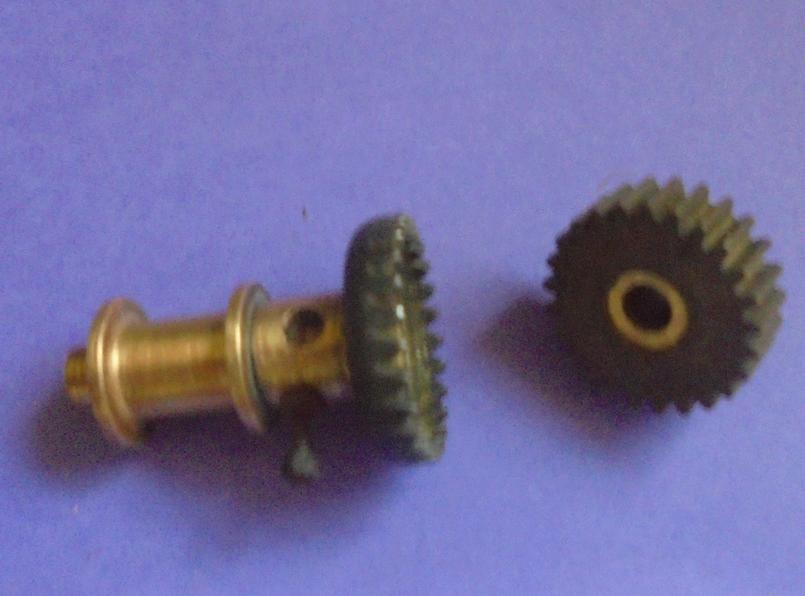 | Position d'embrayage : on descend la tige de commande et le ressort accomplit son office en venant plaquer la roue de chant contre le pignon.