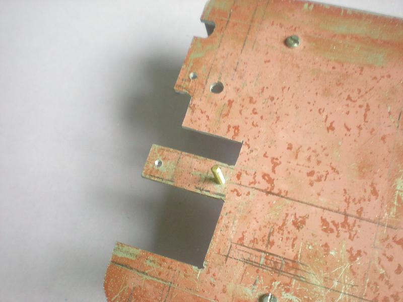 dans lesquels vont venir se maintenir les montants verticaux. Travail dans de la même tôle : ciseaux et pinces. Ces supports seront fixés à la caisse par des boulons M1.6, écrou à l'extérieur. |