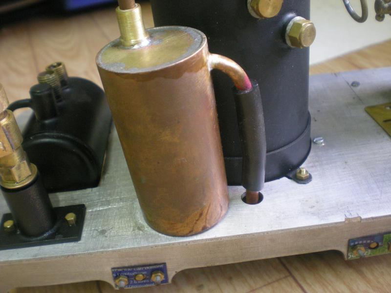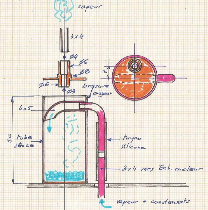 Notre petit moteur produit pas mal de condensats au démarrage. Un déhuileur s'impose. Celui proposé est un peu grand ... mais il a l'avantage de se démonter facilement pour la vidange.