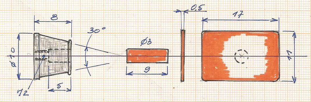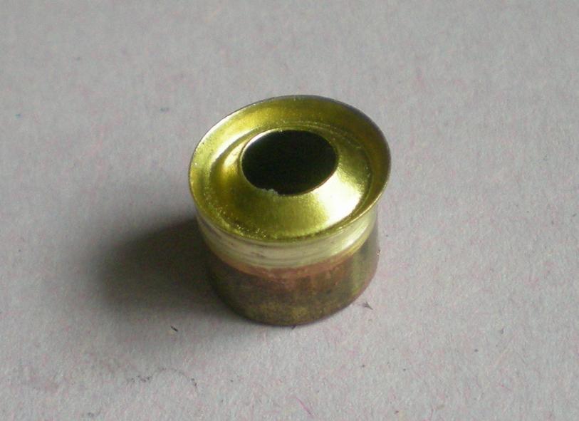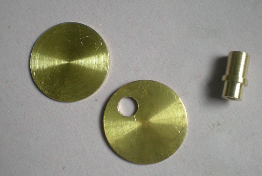 On les réalise simplement avec une coupelle en laiton de diamètre 13 extérieur (quincaillerie) et un morceau de tube de 10 x 12 de longueur 8. Pour souder à l'étain la coupelle, on exécute à la lime un chanfrein sur le tube. On enduit ce chanfrein de soudure, on pose la coupelle bien poncée (elle est vernie) et on chauffe. Un support en alu de diamètre 10 sera percé à M2 et on y glissera le montage réalisé. Normalement il n'y a pas besoin de coller. La vis M2 qui servira au montage bloquera en même temps la rondelle de plexi qu'on ajoutera avant de glisser le tube de laiton. |