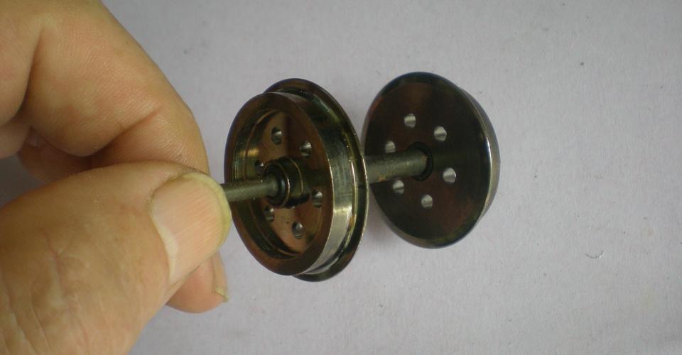 | Une roue terminée pour un essai de résistance. Le bagues sont collées à l'Araldite pour métaux et ça tient bien. Cependant si on se rate - tout m'arrive -, il suffit d'un coup de marteau comme pour enlever la bague d'origine. |