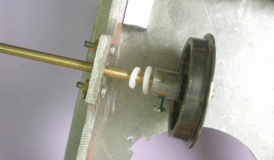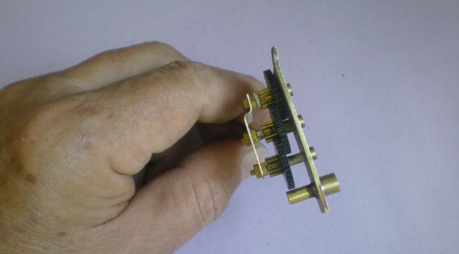 Les roues dentées tourneront sur des vis M2 et on ajustera des bagues de 2 x 3 pour qu'elles ne se touchent pas. Celle de l'axe des roues doit se glisser sans toucher la contre-plaque. |
