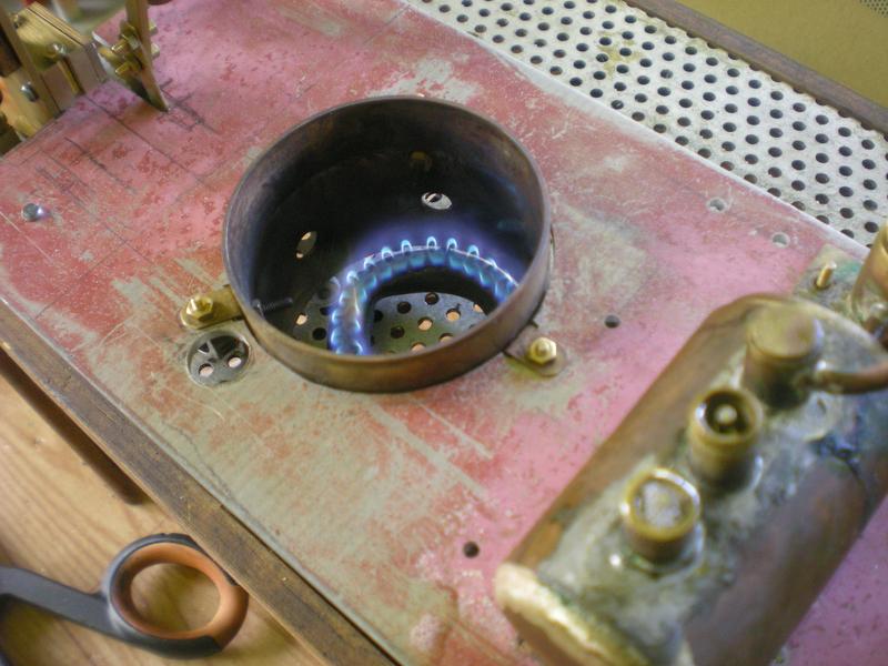 Une fois les pleins faits et le décanteur (déshuileur) vidé, on allume le brûleur. Comme il y a peu de place sous le tramway, le mieux est de le faire en présentant la flamme au haut de la cheminée : ça fait Plof, on vérifie que c'est allumé et on peaufine le réglage de la flamme (aucune ne doit sortir du support. On présente la main au-dessus de la cheminée et ça doit chauffer.