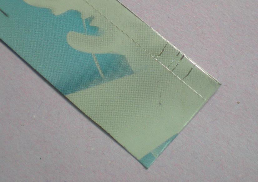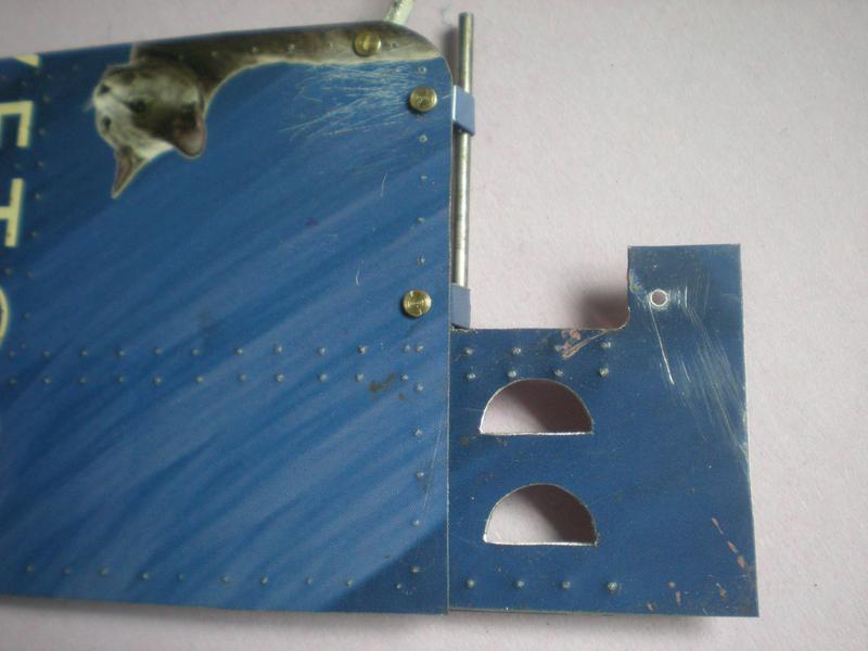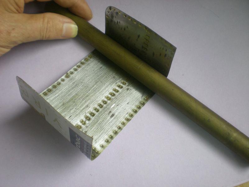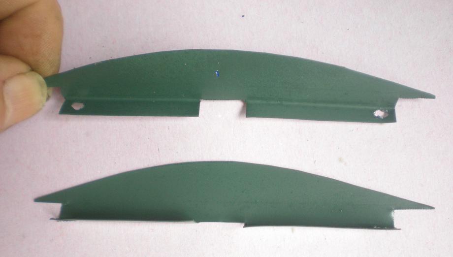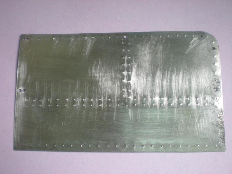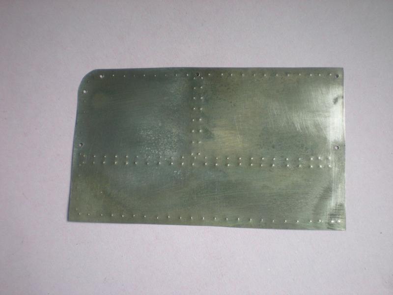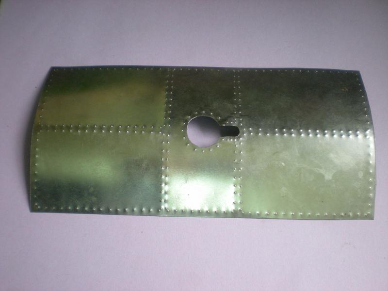 Toute la découpe se fait avec des ciseaux. Les rivets sont imités par poinçonnage. Le problème est celui de l'alignement correct des empreintes : tracer avec une pointe fine les lignes parallèles et on va obtenir sur la tôle ou dans la peinture (mieux) une ligne avec un léger relief. Toujours à la pointe fine et en appuyant avec la main, faire une première empreinte qui situe le rivet. Placer alors la tôle sur une plaque d'alu et se servir d'un pointeau et du marteau pour imiter le rivet. Quelques essais préalables pour marteler avec une force identique ... |