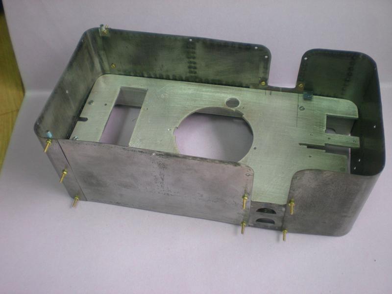 carrosserie | Elle est réalisée avec de la tôle de récupération de 0.3 mm environ d'épaisseur provenant de boîtes diverses. Au départ mon intention était de souder à l'étain les différents éléments et tout a été décapé après la découpe. Malheureusement, impossible d'effectuer ces soudures et le montage s'est fait par vis M1.6.