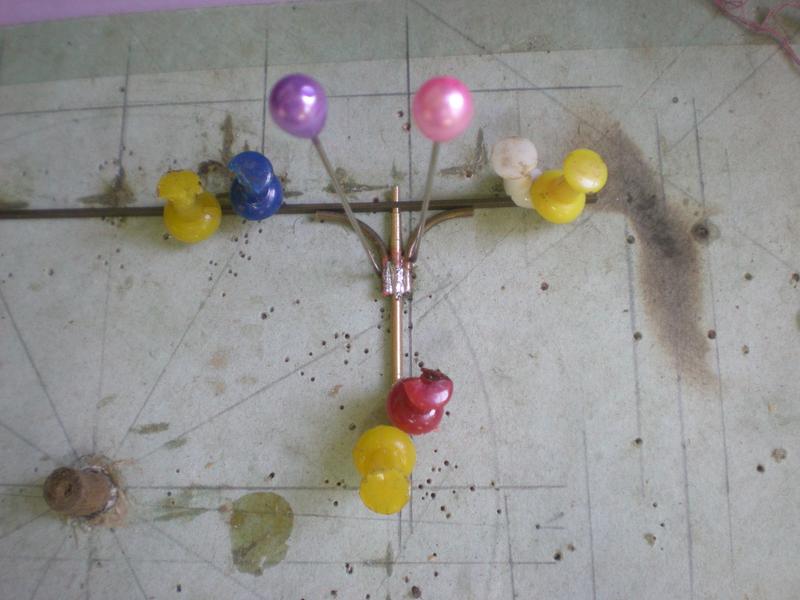 Le montage que l'on peut réaliser sur du placo : les parties courbes appuient sur un plat de 1 x 2 percé à 1.7, comme dans la position qui sera la leur lors du montage final. La soudure se fait à l'étain au fer à souder. C'est l'envers de cette soudure que l'on montrera à l'extérieur ! |