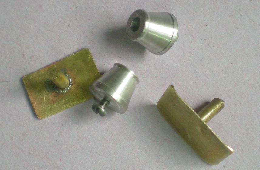 | Toutes les pièces pour deux tampons. Le montage se fait à l'Araldite, la fixation sur la caisse par une vis M2. |