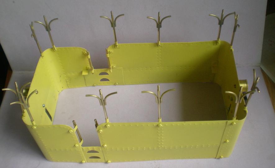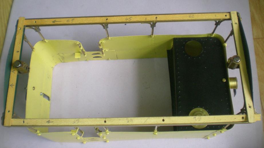 Il m'a semblé qu'on recherchait pour ces tramways le minimum de choses dépassant de la carrosserie. Aussi pas d'échelle cette fois, mais une main-courante intérieure réalisée avec du rond de laiton de 2 que l'on maintient par des supports en tôle. |