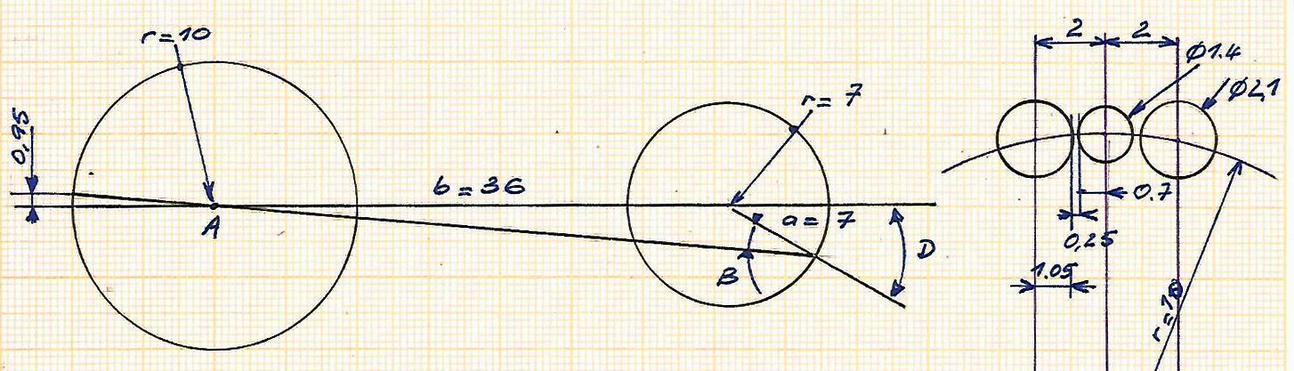 |  A gauche, un croquis pour le repérage des joues du vilebrequin. On y trouve également les données pour l'usinage de la platine du moteur.