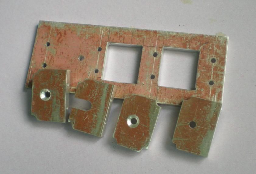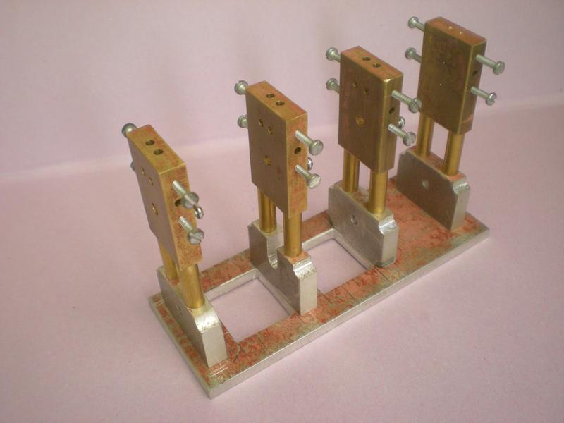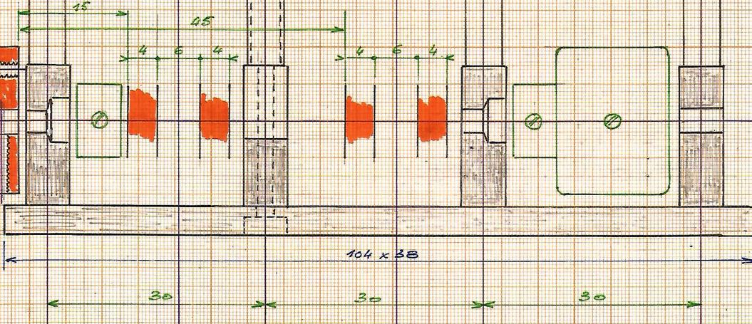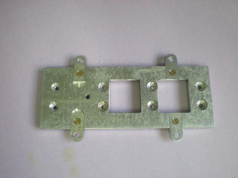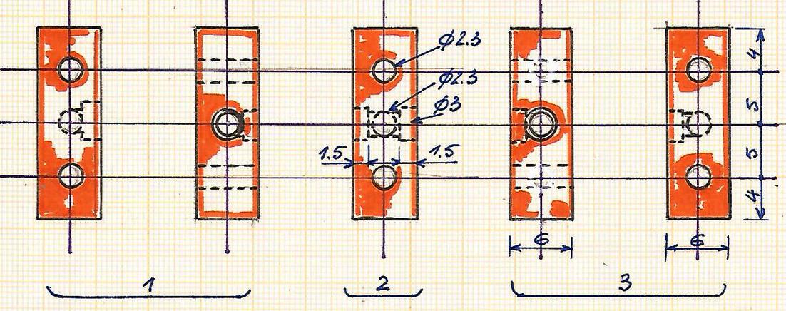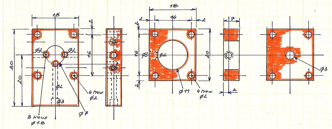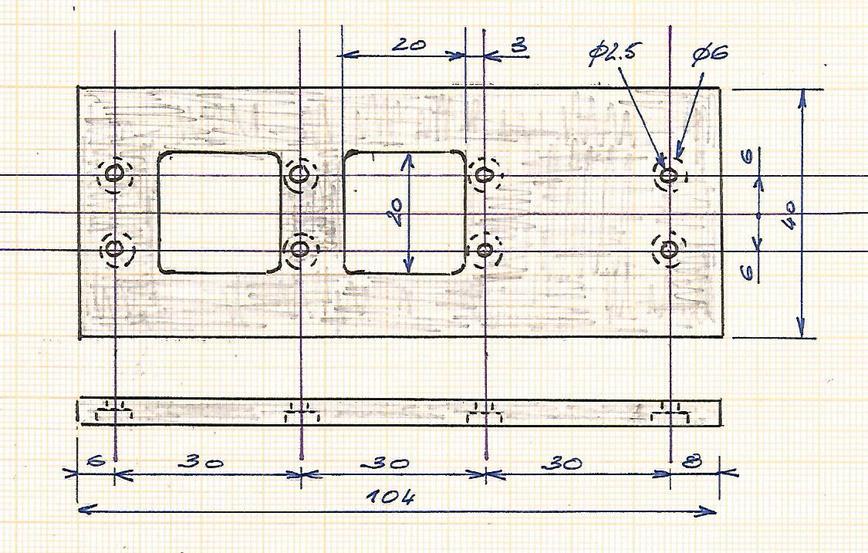 socle, supportsLe socle de 104 x 40 est en alu de 3 d'épaisseur. Les perçages qui vont recevoir les vis M2 de longueur sont de 2.5. Les supports, ou tout au moins leur base sont en alu de 6 (pour le dessin, voir le premier croquis). Là aussi il faudra les repérer par pointage.