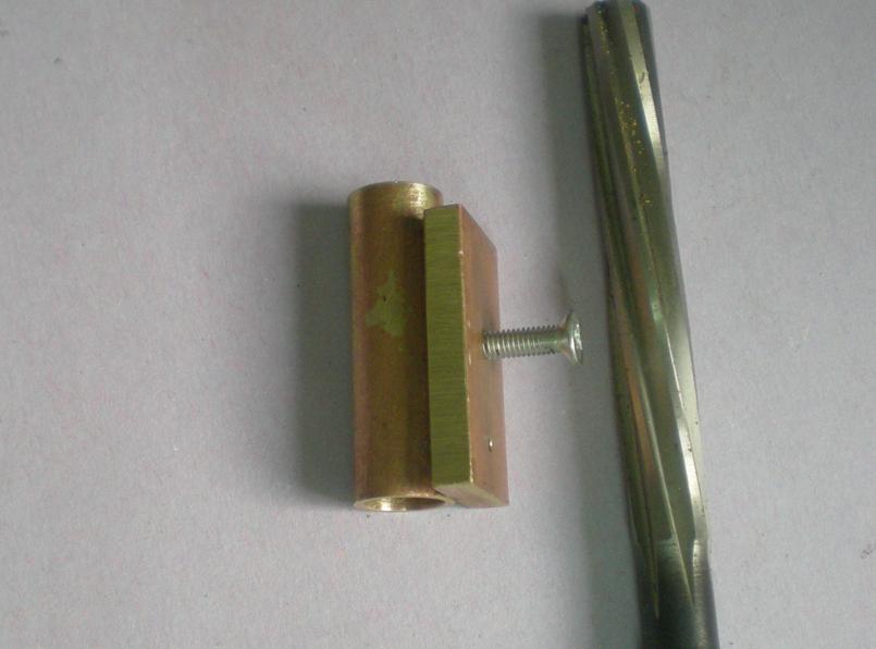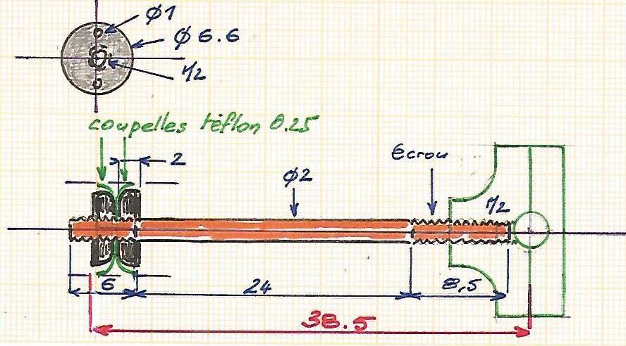 | On obtiendra un alignement correct en procédant ainsi : . traverser le rond percé à 3 avec un foret de 1.6 . faire une encoche de 1.5 de large puis sorti de l'étau . tarauder du côté opposé de l'encoche à M2 . braser le plat de 1.5.