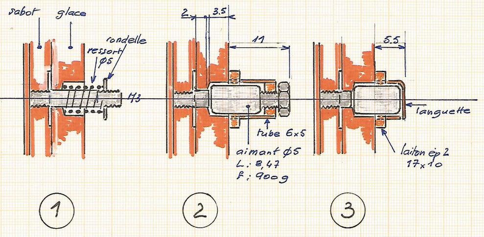 En 3, une autre solution pour palier le manque de place pour utiliser la solution précédente. L'entrefer sera réglé grâce au perçage qui maintient l'aimant à quelques dizièmes de l'axe du sabot. |
