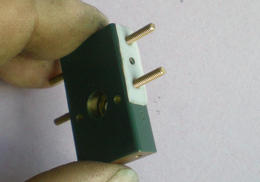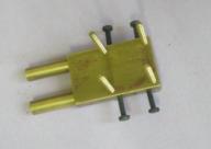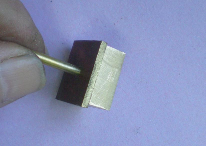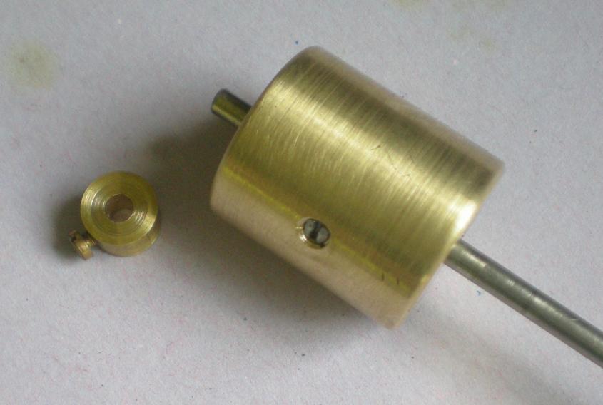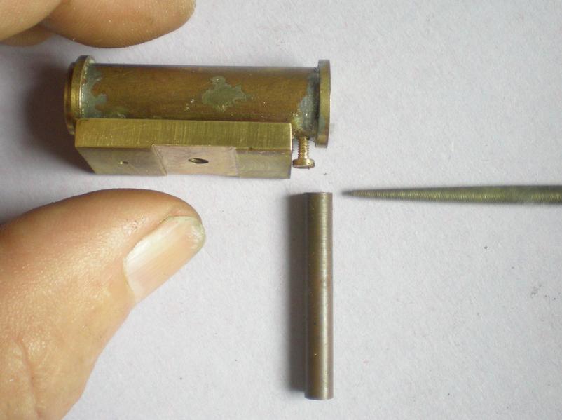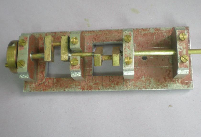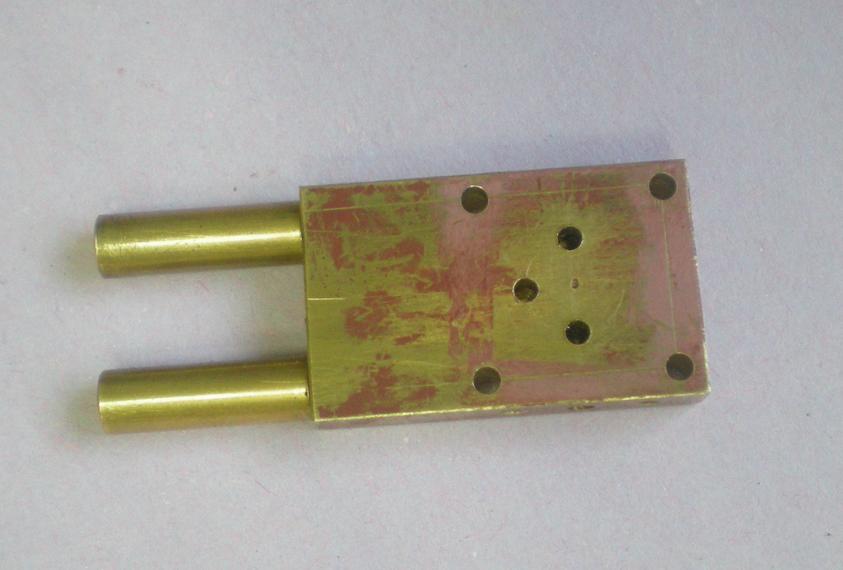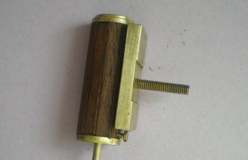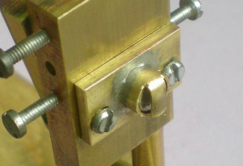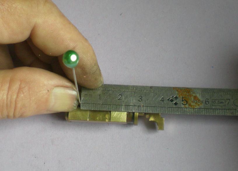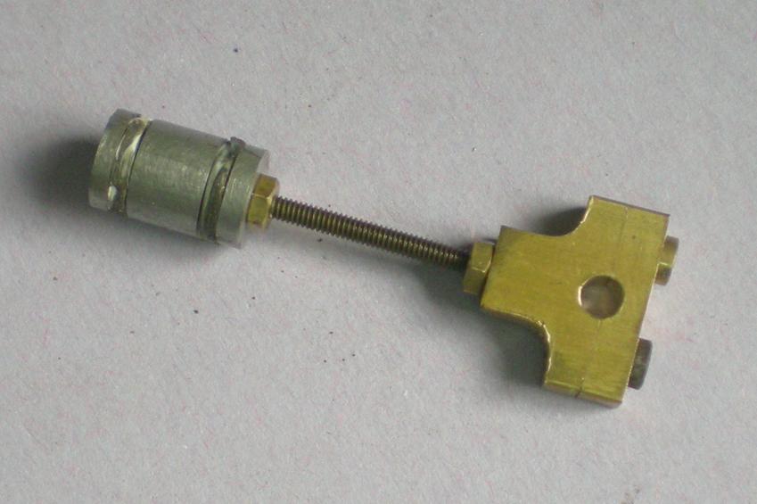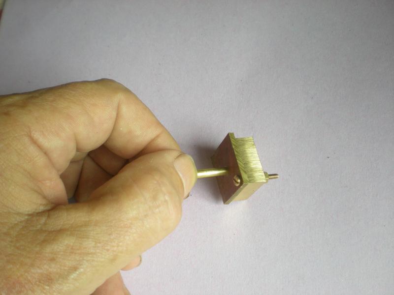 On devine l'aimant enfermé dans sa cage réalisée avec du tube laiton 5 x 6 où l'aimant coulisse. Cette cage est soudée à l'étain dans un plat de laiton de 2 d'épaisseur et de 10 de large percé à 6. Prévoir une petite languette pour empêcher l'aimant de sortir par l'arrière ... bien que, la force d'attraction ! |