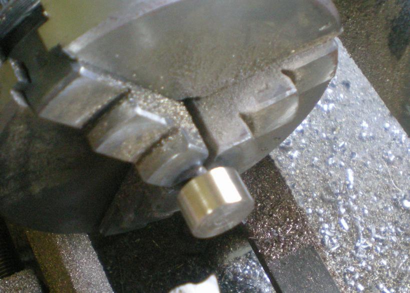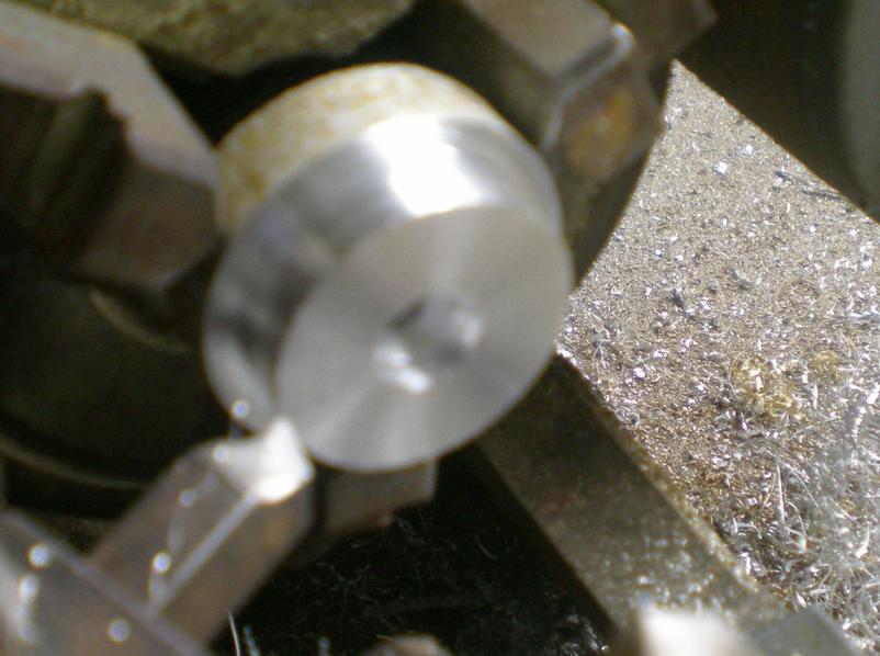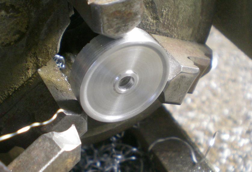 Usinage d'un rond d'alu de diamètre 20 que l'on perce à 3.5 et qu'on reprend au diamètre du roulement en tenant compte de son épaisseur (ici diamètre 7 sur une profondeur de 2.2 pour un roulement épais de 2.