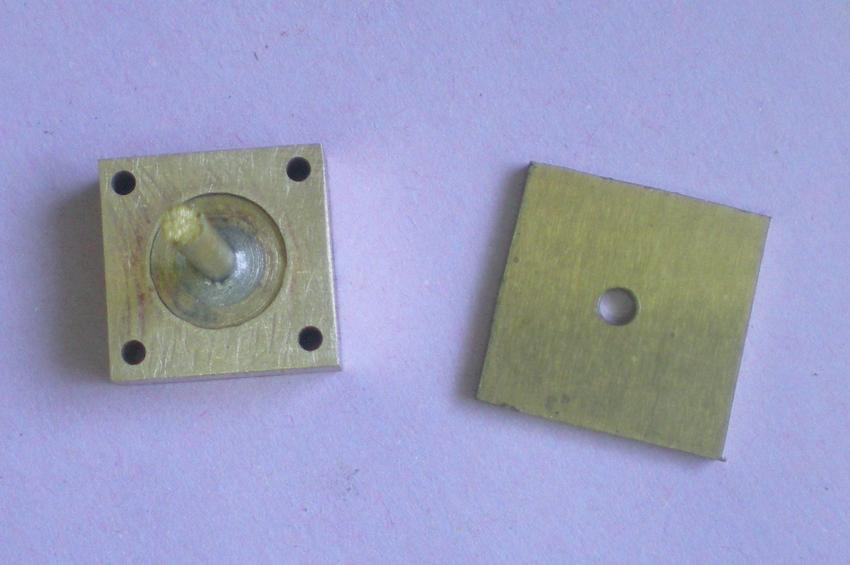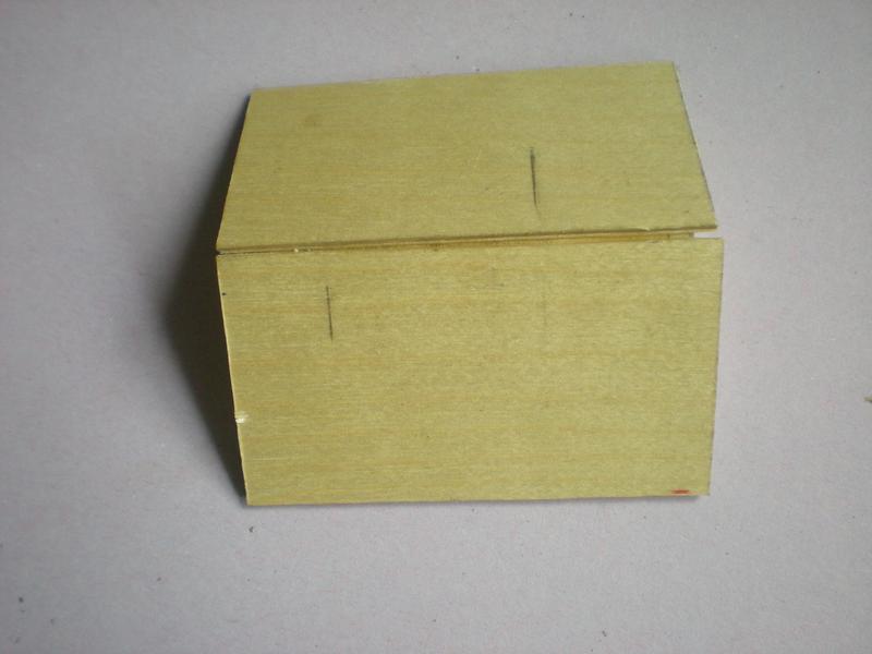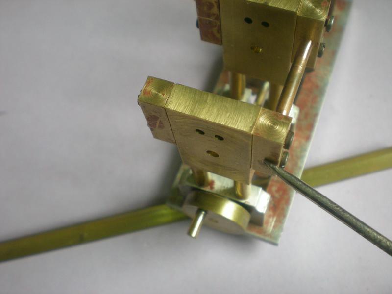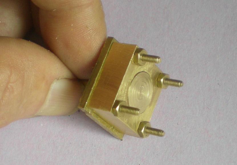 Le futur inverseur est en place dans le corps; sur le côté le couvercle en tôle de laiton de 2 découpé pour déborder de 1 ou 2 mm sur les bords du corps après perçage à diamètre 3. |