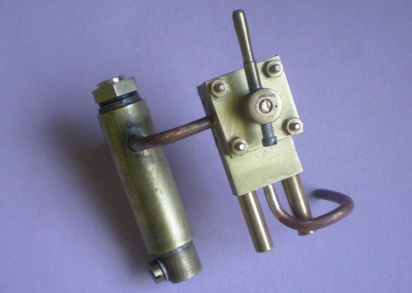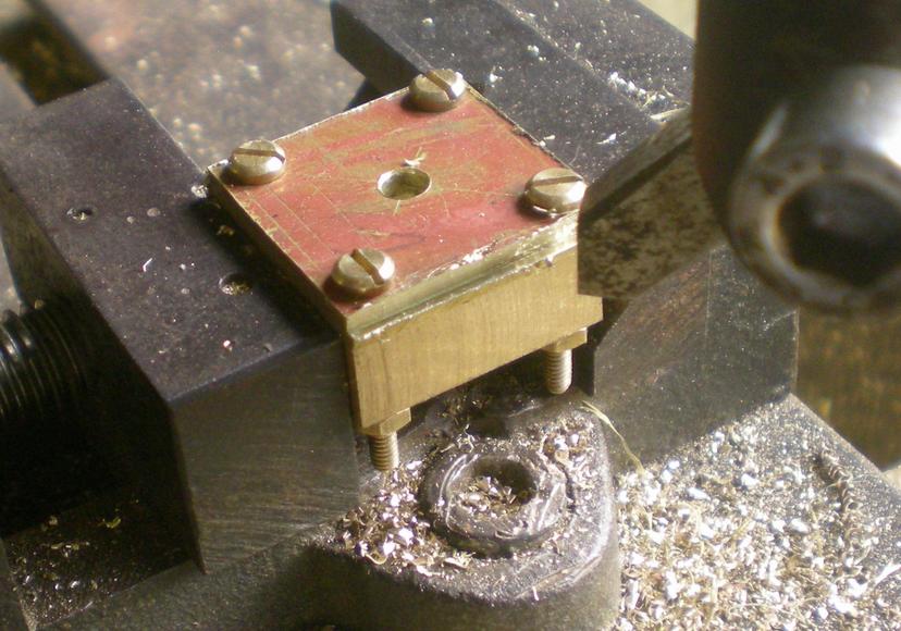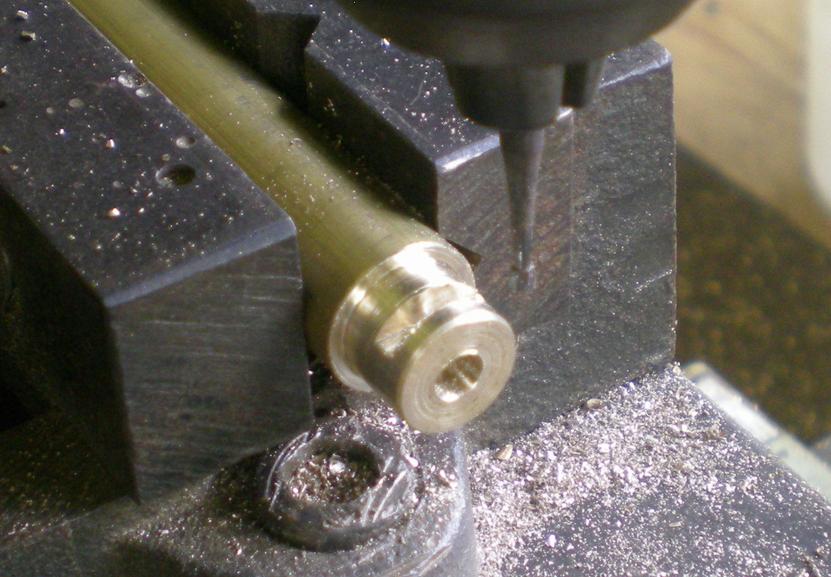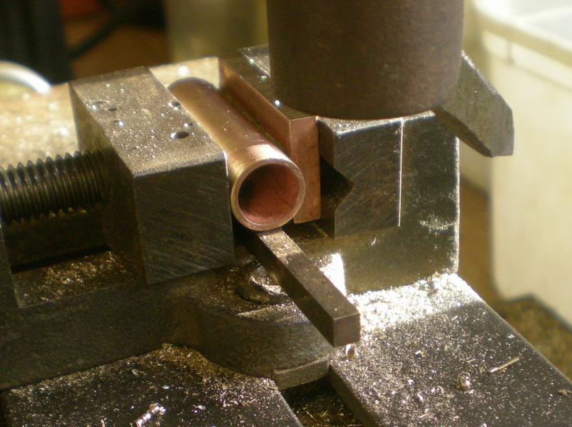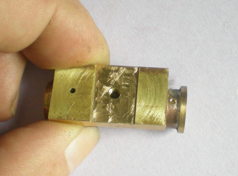 | Perçage du corps pour l'arrivée de vapeur. Le tube de 2 x 3 est brasé à l'argent sur le corps et on utilise de l'étain pour la fixation du graisseur. Calculer la longueur du tube de raccordement pour que le graisseur arrive entre les bâtis 3 et 4 sinon impossible de visser les tubulures. |