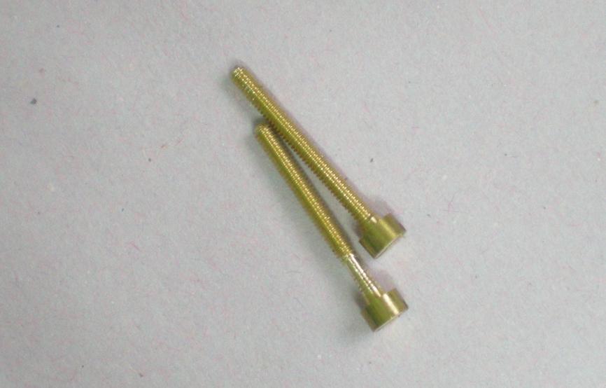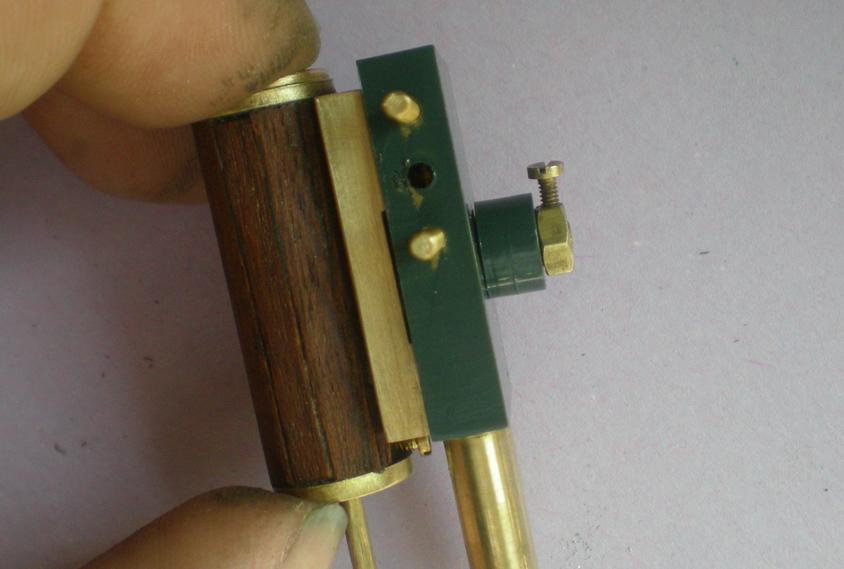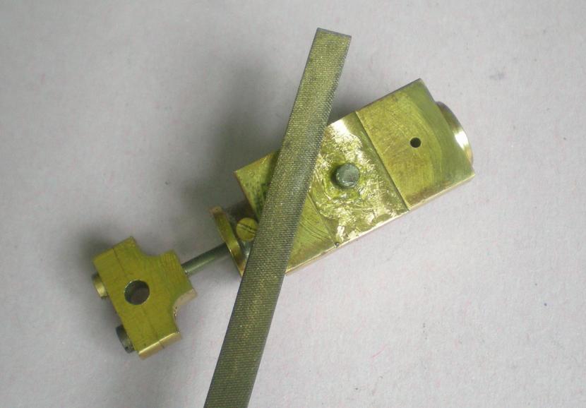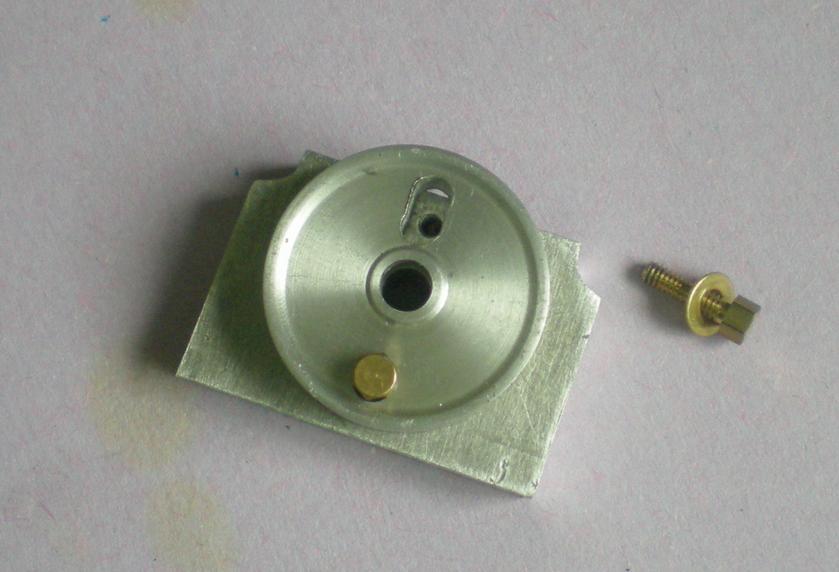 | Une idée pour dissimuler un peu la vis de blocage (M1.6) du guide de la tige de piston. Pas facile à mettre en place cette vis sauf avec la v"visseuse" maison !. Un coup de lime pour supprimer toute bavure nuisible aux coupelles de téflon. |