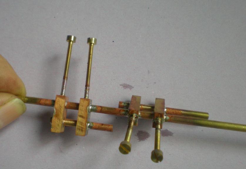 les tubuluresOn utilisera du carré de laiton de 6 x 6 et du tube de cuivre de 2 x 3. La seule difficulté étant le repérage car les raccords des extrémités sont percés différemment. Deux forets à utiliser : 2.3 et 3.