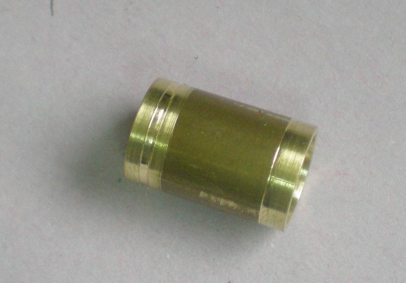 On peut aussi envisager la solution d'un piston comme celui-ci : rond d'alu (du laiton serait mieux)coulissant parfaitement dans le cylindre avec deux gorges et enroulements de téflon en ruban. Je n'ai pas poursuivi l'expérience car mon piston était trop court : il lui faudrait au moins une longueur de 15 pour qu'il soit correctement guidé. C'est envisageable, même si il sort du cylindre en position de PMB. |