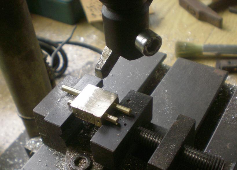 | Perçage en série de la barre de laiton de 15 x 4 : trous de diamètre 3 distants de 7 mm. Sur le sommet, perçage à 1.6 et taraudage à M2 pour le futur blocage. |