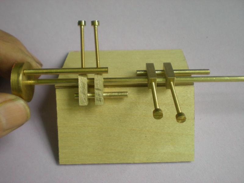 Premier montage : le maneton est vissé à l'envers sur le volant mis en position. On enfile les ronds de 3 qui seront les futurs manetons et, une fois le serrage effectué, cela devrait se maintenir en place. |
