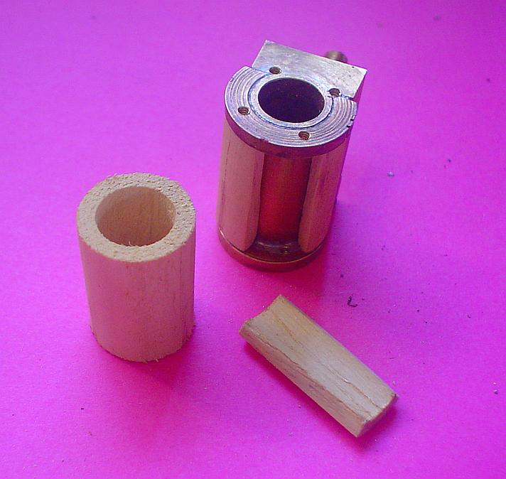 Une autre méthode : usiner un rond de bois, percer au diamètre du cylindre et la couper à dimension. Couper l'excédent ( entre rond et sabot) puis avec le cutter, supprimer la partie arrondie intérieure pour pouvoir glisse la pièce obtenue sur le cylindre. Si on ne coupe pas trop, il y aura un léger serrage qui permet démontage et remontage. Le mieux et de couper grossièrement puis de finir au papier de verre. Attention, si on force trop, ça casse ! |
