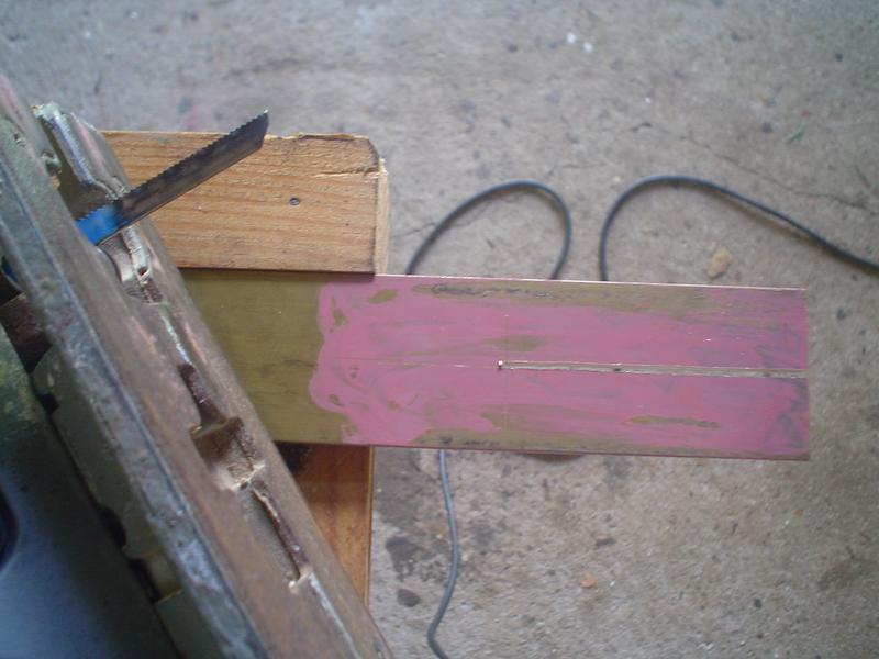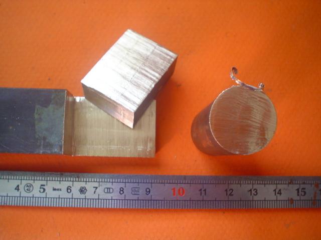 |  4 - oser la scie sauteuse ! | Je ne sais pas si c'est dû à l'âge, mais j'ai de plus en plus de mal à sortir la scie à métaux ! Alors, pourquoi par la scie sauteuse avec des lames à métaux ? Je l'utilisais couramment pour l'aluminium (avec encrassage gênant), voici qu'elle servira pour le laiton... et ça va beaucoup plus vite ! A gauche, découpe d'un plat de laiton de 6 mm d'épaisseur, à droite, découpe d'un rond de 16 mm de diamètre, puis rond et carré de 20 ... qui, pour une fois, seront pratiquement d'équerre. |