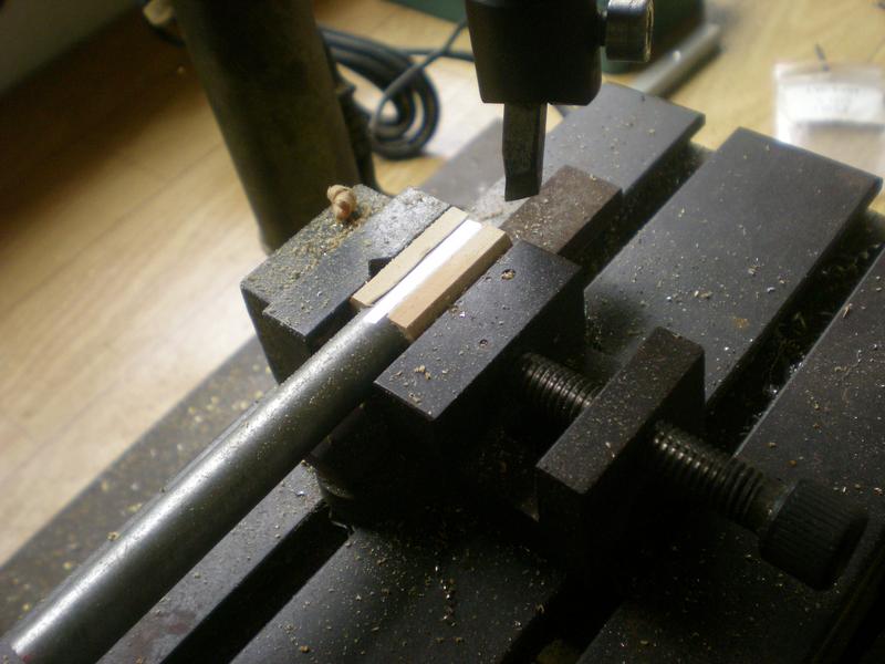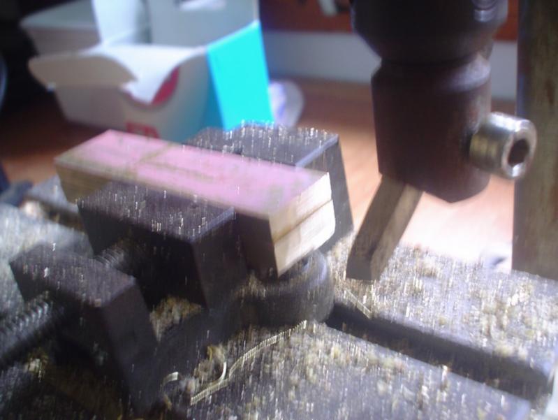 | Travail à la fraiseuse (mieux que la scie ou le cutter) pour amener les côtés à venir se plaquer sur le sabot. Le rond de bois est cette fois enfiler sur un rond d'alu et on attaquera ce rond sur 0.5 mm de profondeur, ce qui correspond à la hauteur de la fente creusée pour la brasure du cylindre sur le sabot. |