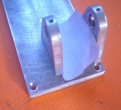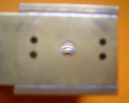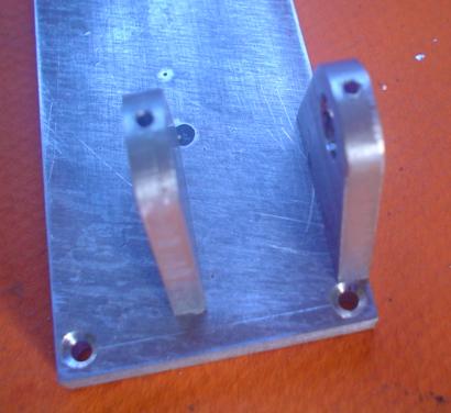 | Voici le gabarit de perçage qui vient de servir au perçage des trous du sabot en plaçant un axe de 3 dans le roulement et le trou du pivot et ... on voit que notre gabarit et notre bâti ne sont pas parallèles. Mais cette fois ce n'est pas grave car nos trous sont percés à distance égale de l'axe principal. Il tournera aussi bien dans un sens que dans l'autre. |