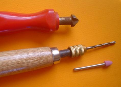 1 - il peut s'agir de traces qui apparaissent à cause de trous mal ébavurés. Comme ils sont petits, on ne peut pas utiliser la fraise conique à 90° (en haut). On y parvient facilement en passant la pointe d'un foret un peu plus grand que l'on place dans un porte-outil ou encore une fraise conique - mais léger, léger car il ne s'agit pas d'agrandir le trou |