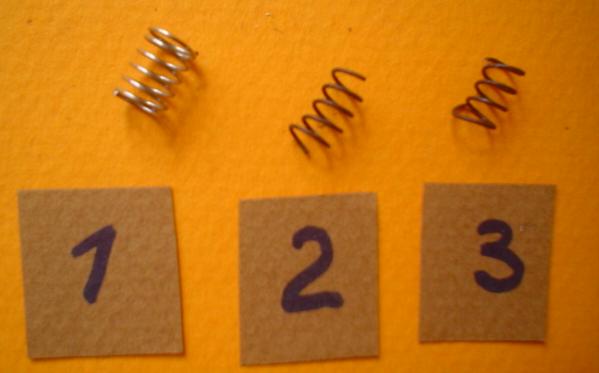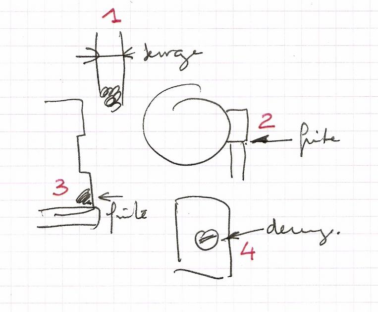 1 - problème tout bête dû au ressort qui plaque le sabot sur le bâti : on trouve rarement le beau et bon ressort dont les bouts sont bien formés (1) et on coupe la longueur nécessaire dans celui que l'on possède avec un défaut : les dernières spires sont en biais et les petits bouts vont s'ingénier à s'introduire où il ne faut pas occasionnant une force qui s'oppose à la bonne rotation. Il suffit, à l'aide de deux pinces de tordre légèrement l'extrémité du ressort vers le bas en respectant le diamètre intérieur (3). |