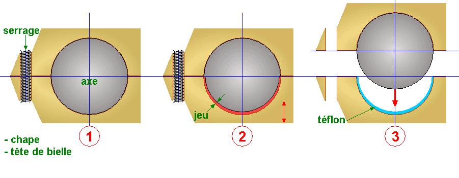Le problème est que le laiton s'use rapidement et que si vous soulevez la chape, vous vous apercevez que le petit "chouia" que vous aviez ajouté s'est bien agrandi (2). Une solution : coincer entre l'axe et une des partie de la chape un petit bout de téflon (on le plie en deux) de la bonne épaisseur pour rattraper le jeu (3)... |
