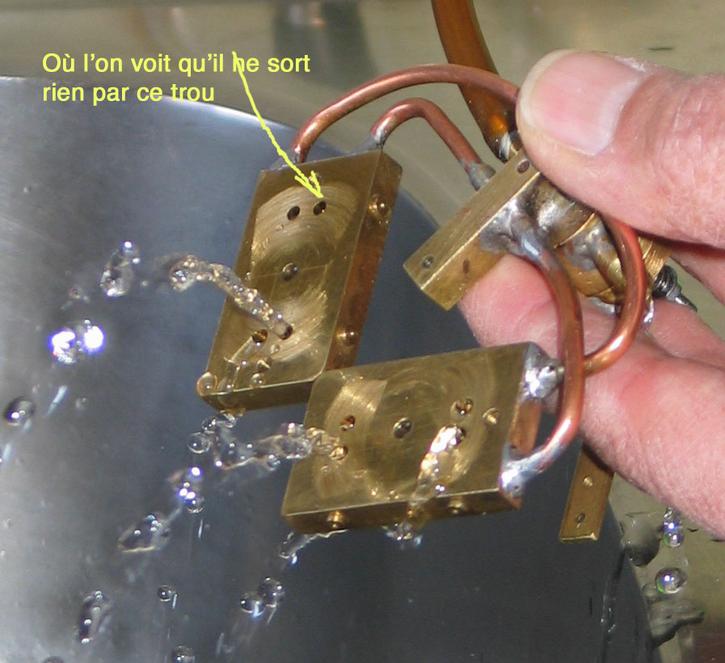 |  | | Voici un bel exemple fourni par Jean-Pierre. Ayant rencontré le même problème, il s'est servi d'une seringue pour envoyer de l'eau dans les tubulures et ... il est évident que l'une est bouchée ! |