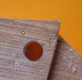 |  | | Pour obtenir ce "beau trou", il suffit de clouer entre deux planchettes un carré de téflon de 1 mm d'épaisseur et de percer au diamètre souhaité ... Ensuite, découpage extérieur. |
