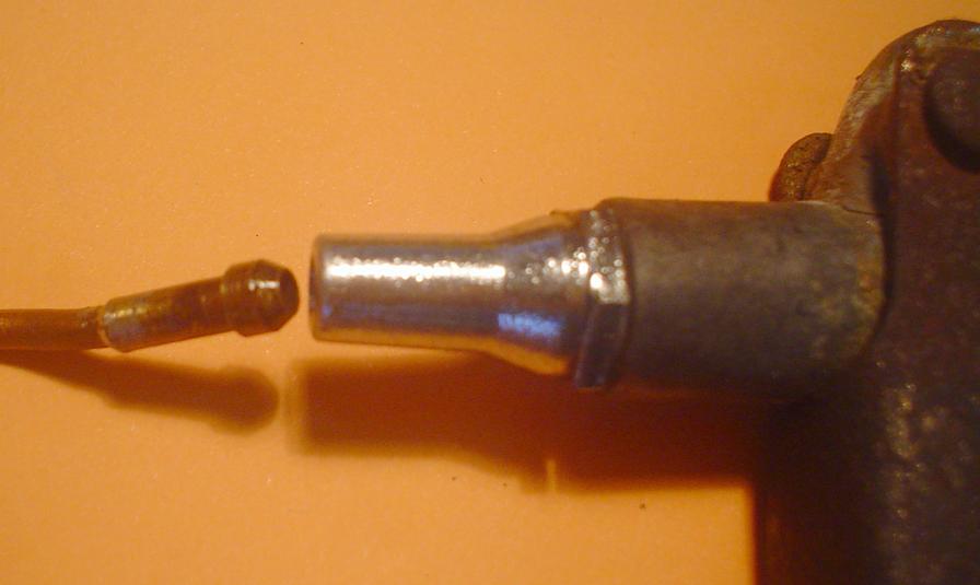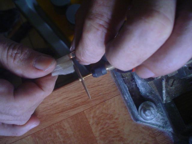 On dévisse l'embout et, au tour, on reprend le trou avec un foret de gros diamètre ... contact correct assuré ! |