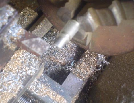 Voici un petit montage qui permet de l'obtenir très précisément : la partie de l'axe déjà usinée est serrée avec un foret de la même épaisseur que le lamage et on travaille l'autre extrémité ... |