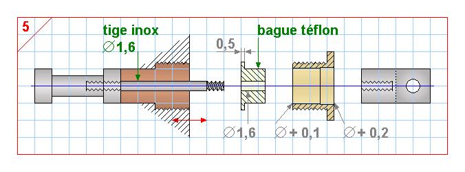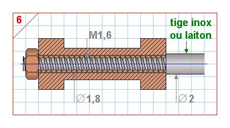 solution n° 6 : pas encore testée. Cette solution désolidarise le frottement du tiroir de la traction faite par la tige. Un tiroir d'un certain diamètre est nécessaire. Je vais essayer avec un tiroir de diamètre 5. On peut imaginer le maintien de l'écrou (non serré) avec un point de frein filet voire d'étain; pour le glissement, on peut revenir à la solution précédente (bague en téflon) |