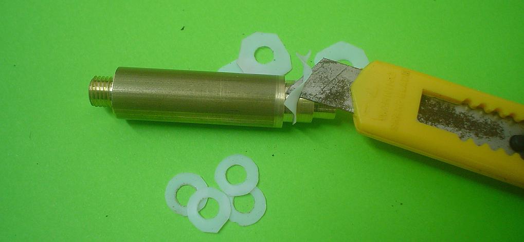 1 - découper un bout de téflon et y percer à l'emporte-pièces, le diamètre intérieur du tube 2 - le placer dans le cylindre avec le chapeau au-dessus et découper au cutter en faisant tourner le téflon 3 - placer la rondelle obtenue sur la collerette, la centrer avec un rond de laiton correspondant au diamètre, percer avec un pointeau dans les trous de fixation : généralement la pastille se détache ; si ce n'est pas le cas, léger coup de cutter à plat et d'un côté et de l'autre 4 - joint obtenu |