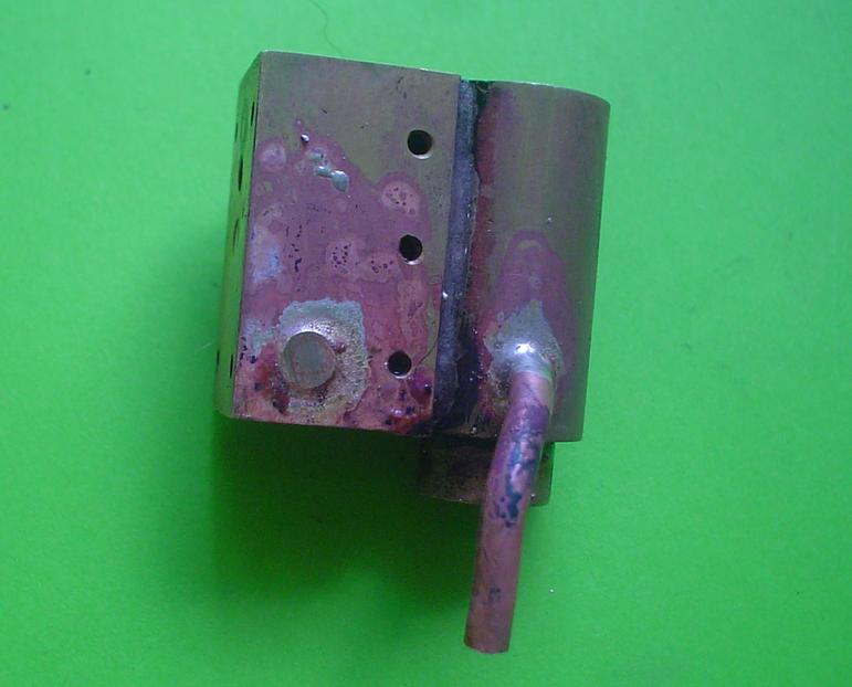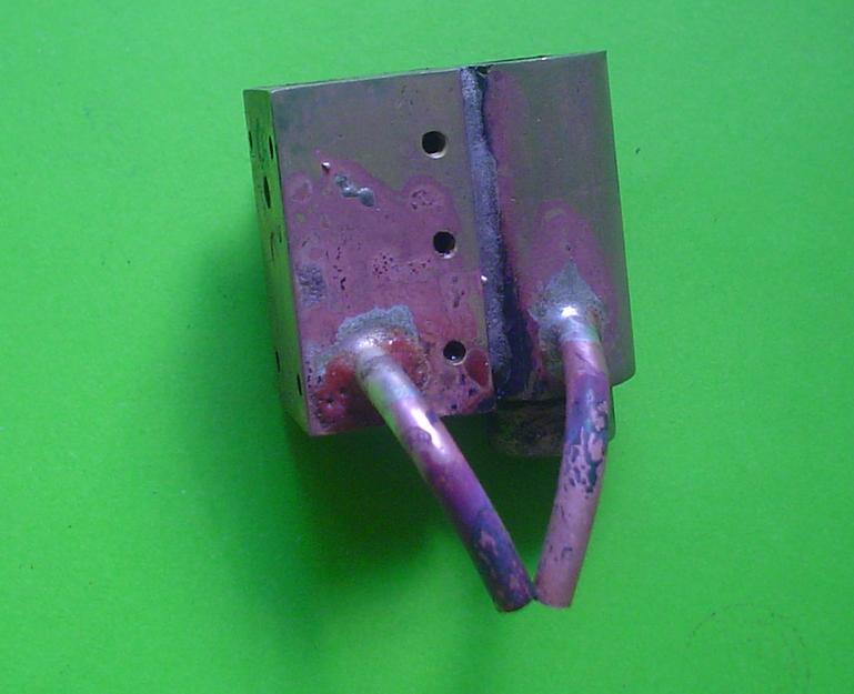 On ne se refait pas et j'ai toujours tendance à mettre trop de brasure ... Pour la tuyauterie de ce moteur, la brasure est indispensable car il sera soumis à la vaporisation instantanée ! Deux échappements, l'un en tête et l'autre en fin de course mais ... |