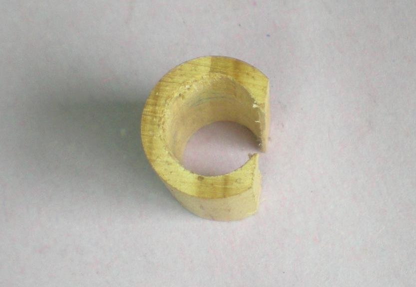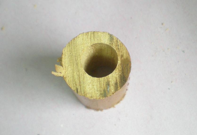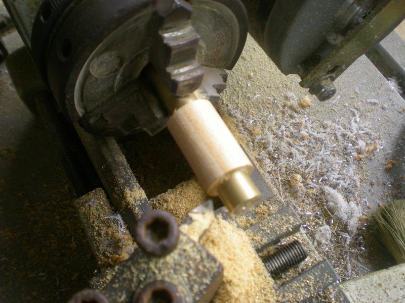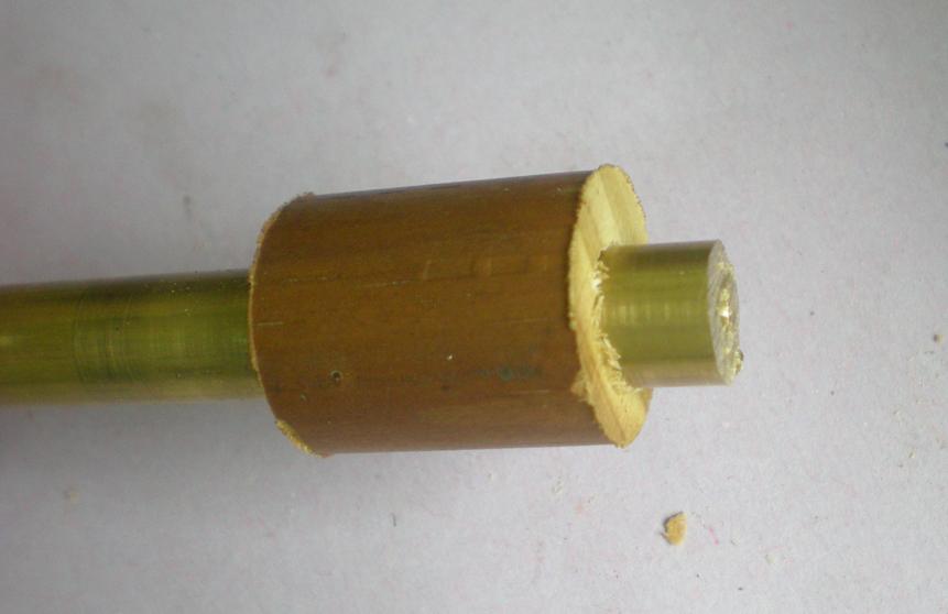 | Pour amener le rond de bois au diamètre extérieur, l'enfiler sur un rond de laiton : ça serre suffisamment pour le tournage ... |