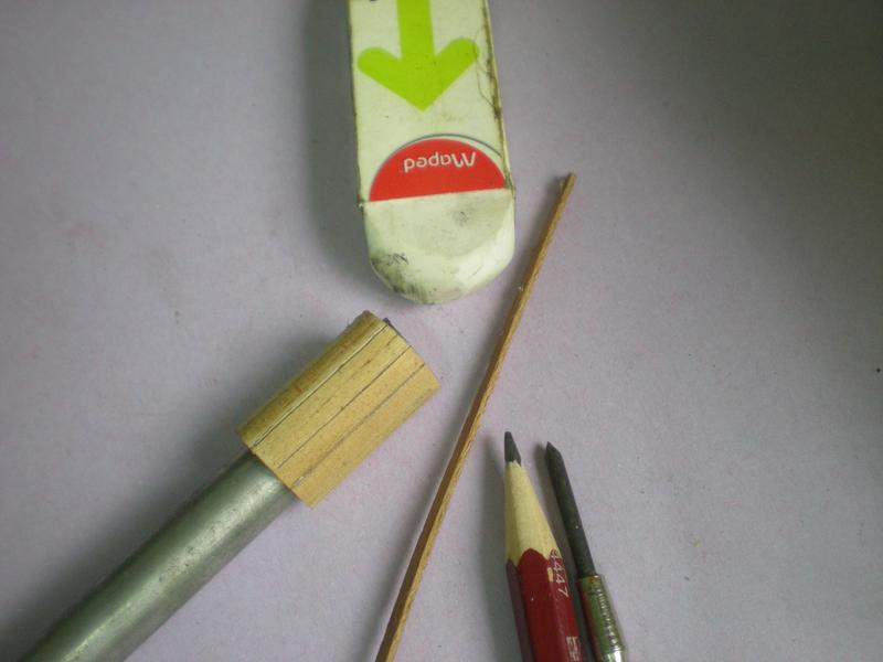| Pour imiter les lattes : une baguette pour le traçage, une pointe à tracer, un crayon pour repasser les joints et une gomme au cas où ... Il n'y a plus qu'à donner un coup de vernis. |
