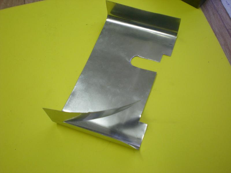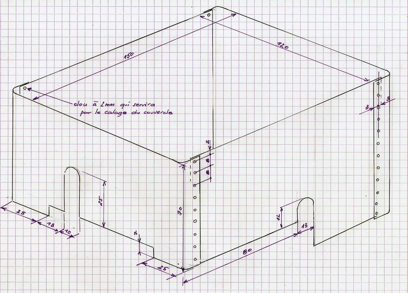 Quand on a plié un côté, on place dans la caisse et on voit si le tracé du côté opposé correspond. Ici, à cause du pliage arrondi, il va falloir découper 1 mm de chaque côté avant le pliage. Noter la découpe des côtés latéraux où il a été tenu compte du recouvrement des tôles. |