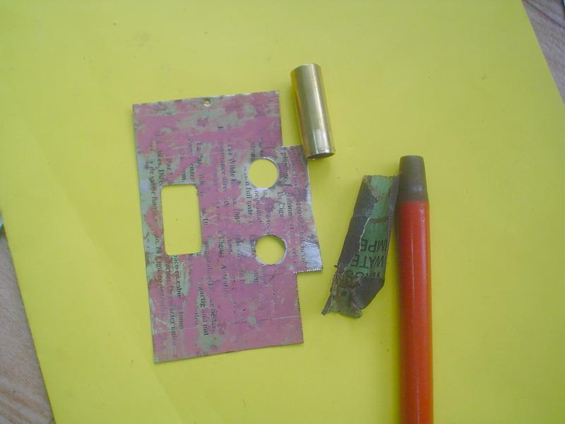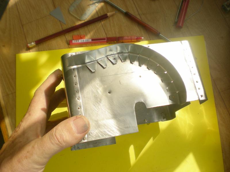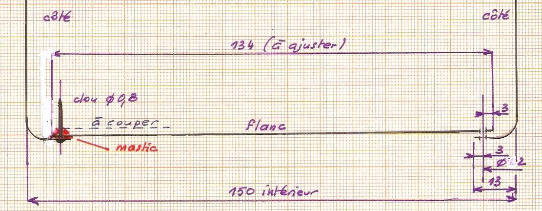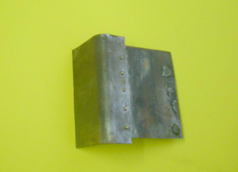 avec une chute de tôle dont les surfaces qui seront en contact sont poncées et nettoyées à l'acétone. Perçage à 1.2 pour recevoir des clous de modéliste à tête bombée de diamètre 0.8 qui imiteront des rivets. On enduit l'un des côtés de mastic, on position la seconde pièce et on enfonce les clous. Une petite heure d'attente puis on retourne la pièce et on enrobe chaque clou de mastic ... Long séchage. |