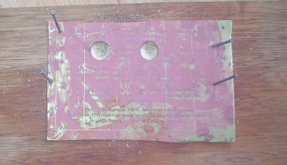 Si on a mis suffisamment de mastic, il ressort un peu au serrage des pinces par les trous supérieurs ; enfiler les clous. |