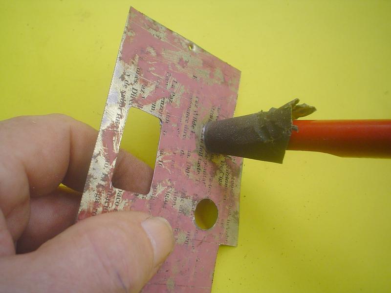 A la lime ce n'est pas facile et c'est long avec le risque de déformation de la tôle. Alors, un emporte-pièces ou un tube conique et du gros papier de verre que l'on fera tourner. Comme référence, le tube (ici un hublot) que l'on veut insérer. |