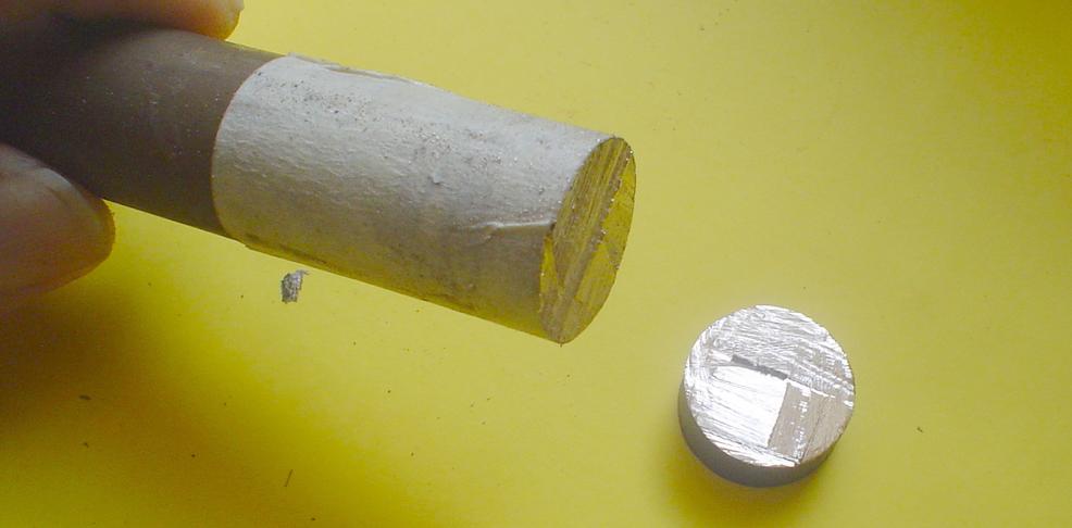66 - sciage d'un rond | Je n'en ai jamais parlé et considérais que sans mini-tronçonneuse à métaux (à construire un jour) mes sciage resteraient des trucs qui obliquaient d'un côté ou de l'autre et qu'il fallait rectifier au tour. Et puis,il y a peu ayant à scier un tube et un rond, il a suffi d'appliquer la même technique pour obtenir une coupe correcte. |