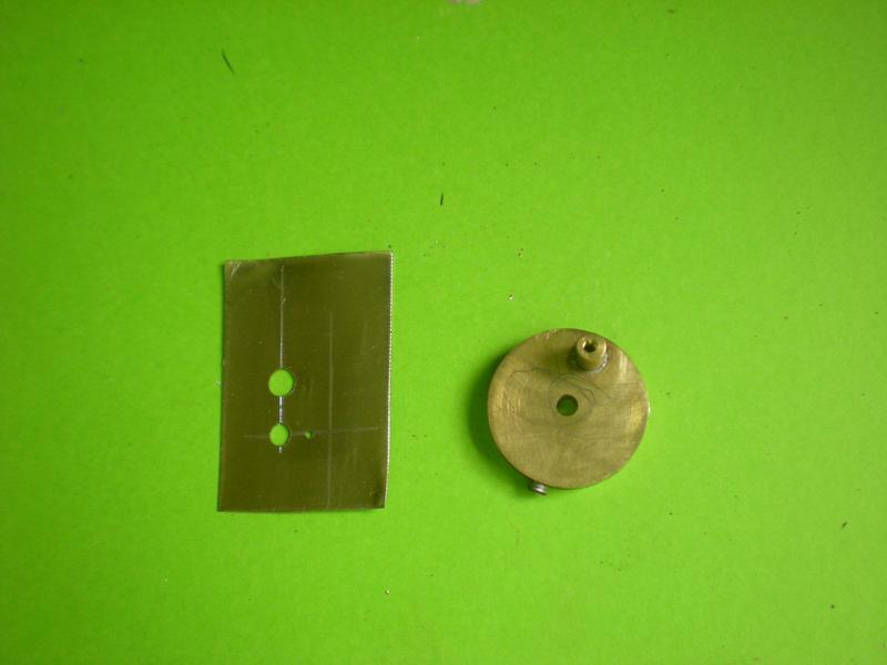 Il est utile aussi de se fabriquer un gabarit en tôle qui servira à percer le second trou sur l'excentrique et à percer le volant pour le passage d'une tige de laiton de 0.5. On utilisera un rond de 3 pour positionner l'axe du volant.